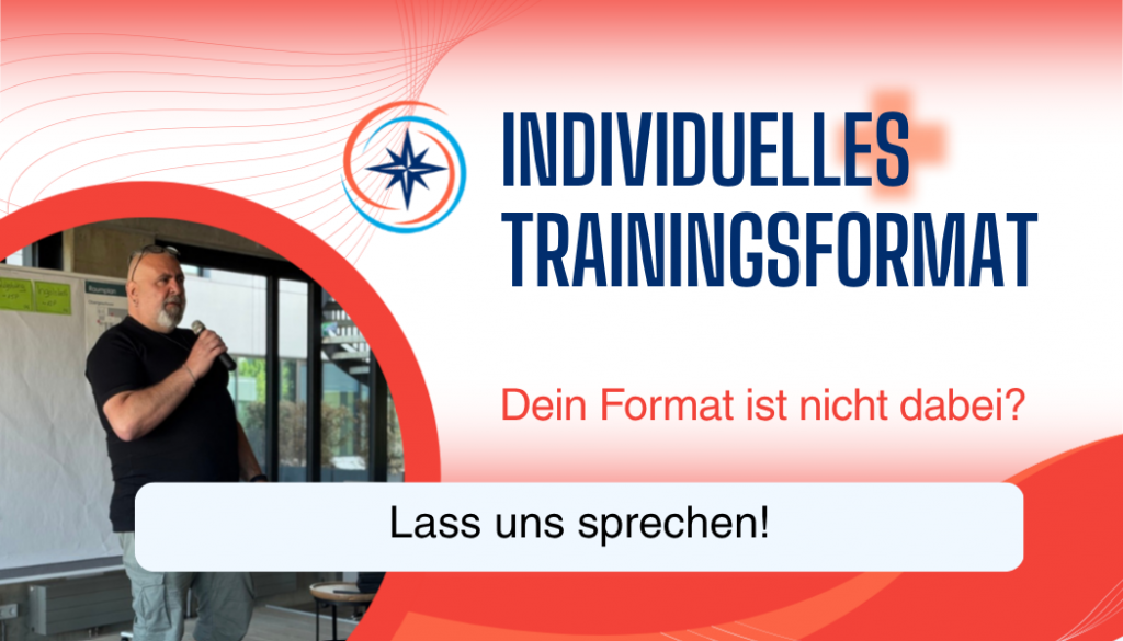 Jedes Training kann in Präsenz oder online stattfinden (via Microsoft Teams und Miro) und wird durch ein Arbeitsbuch begleitet, das Reflexion und Transfer unterstützt.
